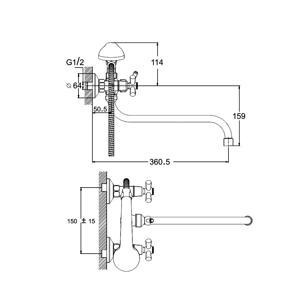 Cмеситель для ванны двух вентильный гусак 35 cм. Высококачественный корпус обеспечит безопасное и длительное пользование смесителем.Переключатель душ-излив, на корпусе, шаровой.