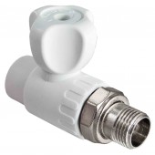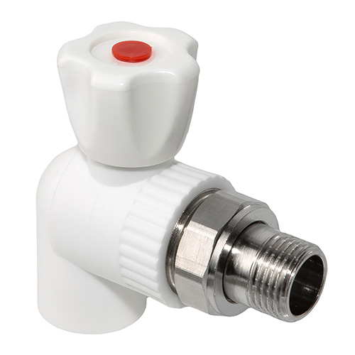 Шаровой кран угловой для радиатора с полипропиленовым корпусом. Применяется для подключения радиаторов к разводке из полипропиленовых труб. Позволяет перекрывать поток теплоносителя через отопительный прибор. Подключение крана к радиатору производится с помощью латунного никелированного полусгона, закрепленного на закладной детали накидной гайкой. Соединение с трубой – раструбной сваркой. Шаровой затвор и шток крана выполнены из латуни, затвор хромирован